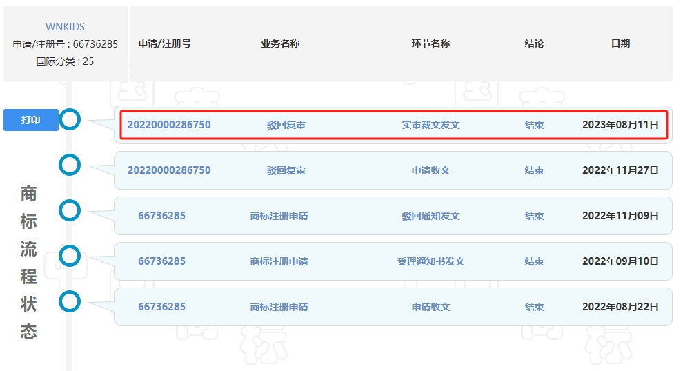 在上面的列表当中,有两个关键商标信息第“5215846”号和第“66736285”号商标“WNKIDS”。